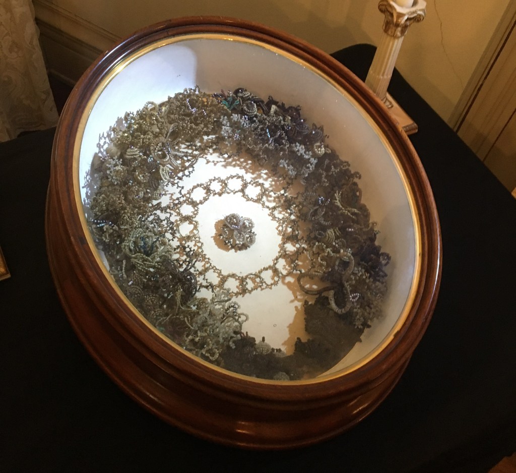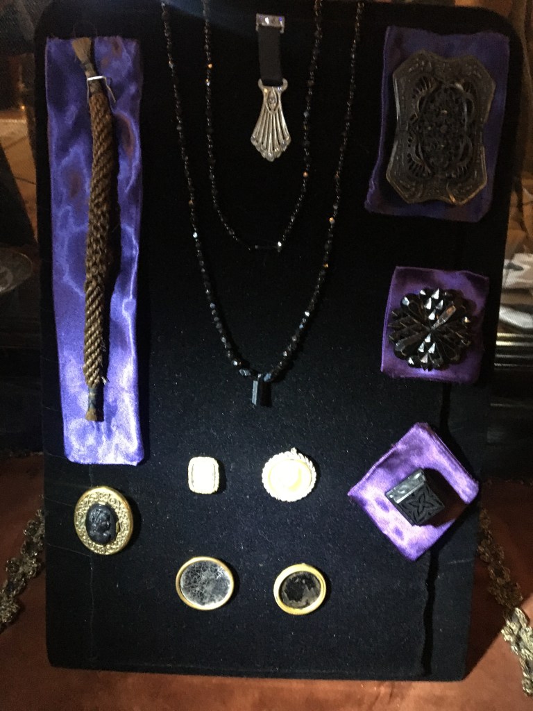 Czarne suknie były obowiązkowym elementem garderoby. Tak jak papeteria, również były okazją do manifestacji poziomu smutku po śmierci ukochanych osób. Po okresie intensywnej żałoby zmieniano ja na ciemnofioletowe. Uzupełnieniem sukni była biżuteria. Oczywiście czarna i bardzo często związana ze zmarłym. Na zdjęciu powyżej, po lewej stronie bransoletka upleciona z włosów. Na dole zdjęcia (przepraszam za jakość, ale uwierzcie mi na słowo) w dwóch, okrągłych broszkach za szkłem umieszczono pukle włosów zmarłych osób. Biżuteria z włosów była uważana nie tylko za romantyczną, ale też po prostu modną.